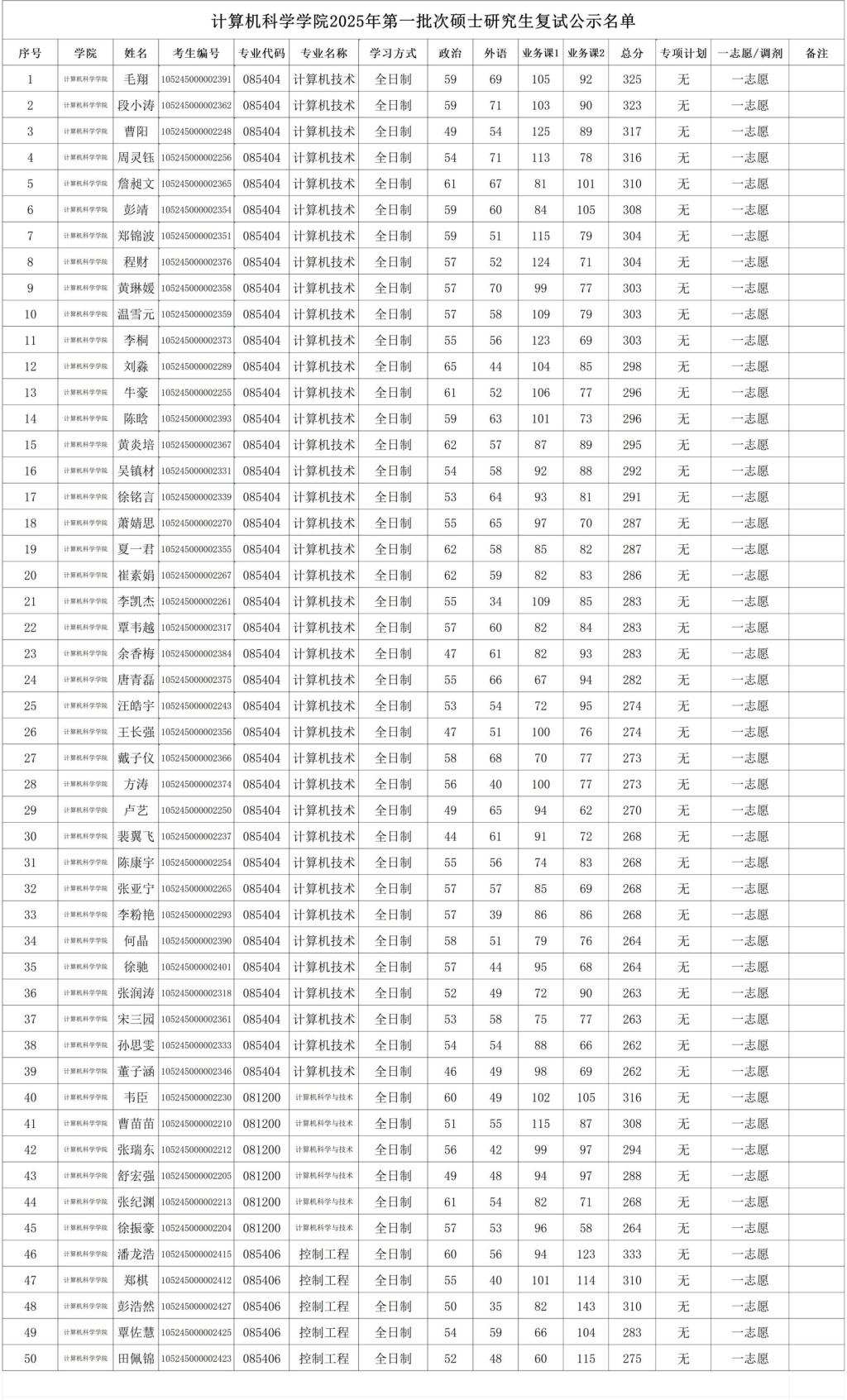 附件5:計算機科學學院2025年第一批次碩士研究生復試公示名單