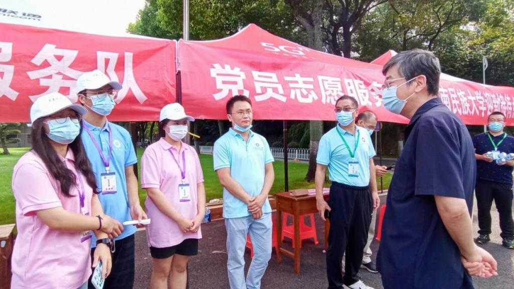 離開正大門,校領導率隊來到了設在火之舞廣場的迎新總站,詢問新生辦理入學手續的相關事宜,叮囑相關部門和學院為新同學提供暖心服務。