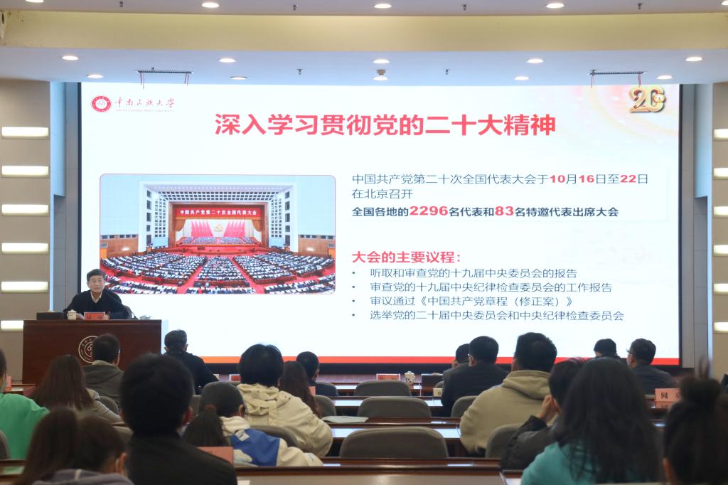 在觀看了黨的二十大精神宣講視頻后,邊境作《深入學(xué)習(xí)貫徹黨的二十大精神,爭做新時代的好青年》主題宣講。他從深刻領(lǐng)會黨的二十大主題,深刻領(lǐng)會過去5年的工作和新時代10年的偉大變革,深刻領(lǐng)會開辟馬克思主義中國化時代化新境界,深刻領(lǐng)會中國式現(xiàn)代化的中國特色和本質(zhì)要求,深刻領(lǐng)會全面建設(shè)社會主義現(xiàn)代化國家的目標(biāo)任務(wù),深刻領(lǐng)會教育科技人才、法治建設(shè)、國家安全等方面的重大部署,深刻領(lǐng)會堅持黨的全面領(lǐng)導(dǎo)和全面從嚴(yán)治黨的重大部署,深刻領(lǐng)會應(yīng)對風(fēng)險挑戰(zhàn)的重要要求等8個方面向同學(xué)們宣講了黨的二十大精神。他指出,習(xí)近平總書記要求全黨把青年工作作為戰(zhàn)略性工作來抓,充分體現(xiàn)了以習(xí)近平同志為核心的黨中央對青年工作的重視,2020級本科生要懷抱夢想又腳踏實地,敢想敢為又善作善成,立志做有理想、敢擔(dān)當(dāng)、能吃苦、肯奮斗的新時代好青年,為實現(xiàn)中華民族偉大復(fù)興的中國夢作出應(yīng)有的貢獻(xiàn)。