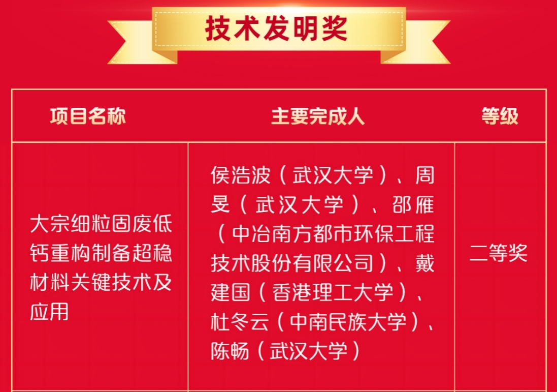 此次獲獎項(xiàng)目為“大宗細(xì)粒固廢低鈣重構(gòu)制備超穩(wěn)材料關(guān)鍵技術(shù)及應(yīng)用”,是由武漢大學(xué)與我校等4家單位共同完成。武漢大學(xué)資源與環(huán)境科學(xué)學(xué)院侯浩波教授為第一完成人,我校化學(xué)與材料科學(xué)學(xué)院杜冬云教授為第五完成人。