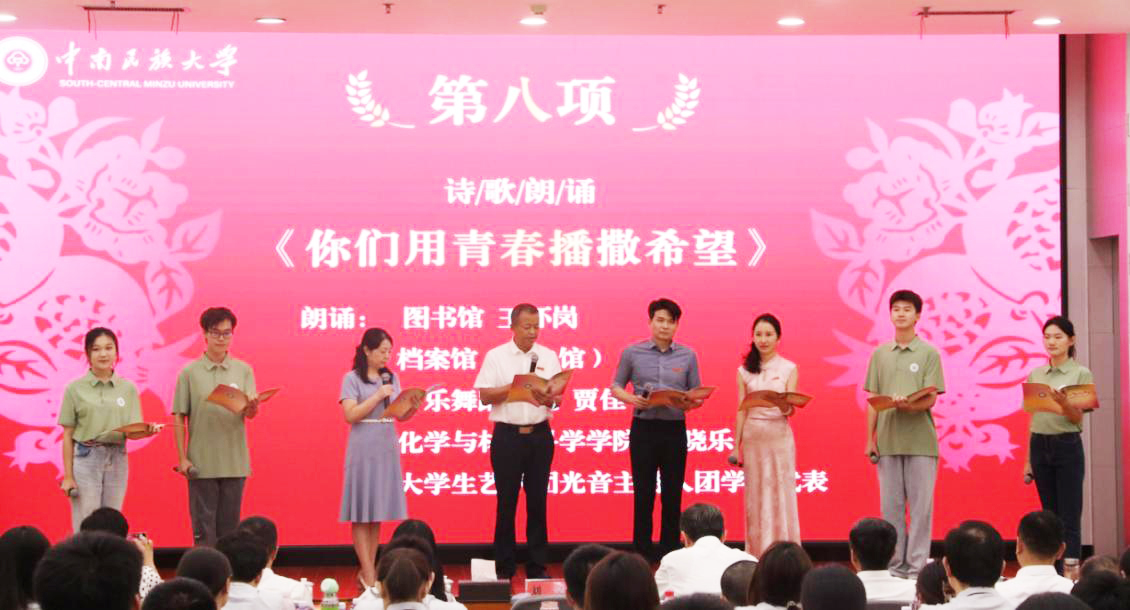校黨委常委為獲獎集體和個人代表頒獎并合影留念,從教滿30年教職工向新入職教職工贈送校徽,學生代表向老師們獻花,感謝老師們的辛勤培育。圖書館王懷崗、檔案館樊俊、音樂舞蹈學院賈佳、化學與材料科學學院韓曉樂4位老師與學生代表共同朗誦了詩歌《你們用青春播撒希望》,收獲了熱烈掌聲。