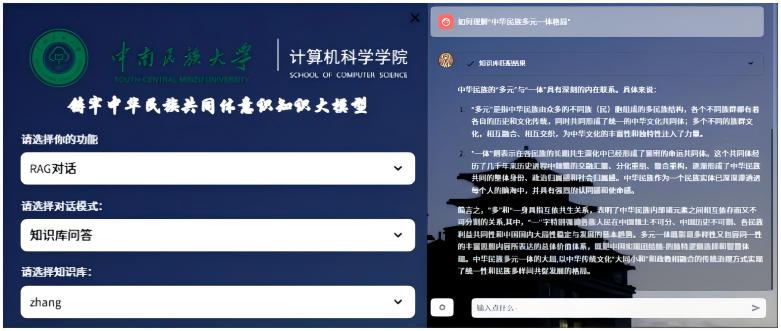 該科研團隊由計算機科學學院張瀟副教授負責,團隊構建了民族工作領域首個大模型訓練自有語料庫。該語料庫以黨的民族理論政策、《中華民族共同體概論》教材、三交史等為養料(1324.4萬字),輔以涉民族領域法規數據庫、相關學術論文(4411.1萬字)。此外,從各級網站獲取約4000萬字語料以及1萬道問答對。形成了民族工作領域大模型建設的正能量內容供給,從底層邏輯上有效解決了大模型價值觀引導等問題。依托該自有語料庫,通過對基于Transformer架構的千億級別基礎模型Qwen2—7B—base進行增量預訓練、指令微調和檢索增強生成,打造面向中華民族共同體意識理解與價值觀對齊的大語言知識模型,并基于強大的自然語言生成能力,實現對中華民族共同體學領域知識體系的精準理解。