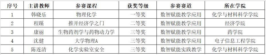 5月15日至16日,首屆全國高校教師數智教育創新大賽全國總決賽在武漢大學舉行,我校教師在大賽中脫穎而出,斬獲多個獎項。其中,化學與材料科學學院韓曉樂老師通過函評進入現場決賽并榮獲全國一等獎。經濟學院程蹊老師榮獲全國二等獎;藥學院康麗老師、電子信息工程學院沈健老師、化學與材料科學學院陳連清老師榮獲全國三等獎。具體獲獎信息如下: