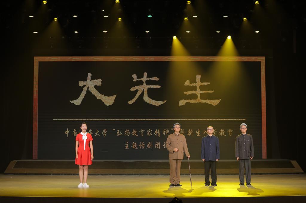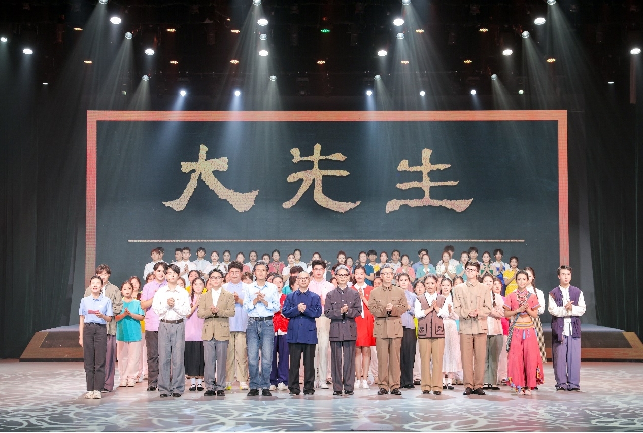 話劇《大先生》以學(xué)校辦學(xué)歷程為敘事主線,通過青年學(xué)子尋訪校史照片的線索,打破時空界限,讓學(xué)校三代教育者在同一命題下展開對話,通過白瑞西、吳澤霖、嚴(yán)學(xué)宭等創(chuàng)校先賢在民族危亡之際“教育救國”的拓荒實踐,柏貴喜教授等學(xué)者“教育報國”的田野堅守,以及臺下新時代師生“教育強國”的使命呼應(yīng),實現(xiàn)“角色—演員—觀眾”三重身份的融合升華。演出巧妙融入《西蘭卡普》《曙光》等特色歌舞片段,打造了一堂融校史傳承、思政教育與美育浸潤于一體的“大思政課”新范式,讓師生在藝術(shù)沉浸中觸摸教育家精神的溫度。