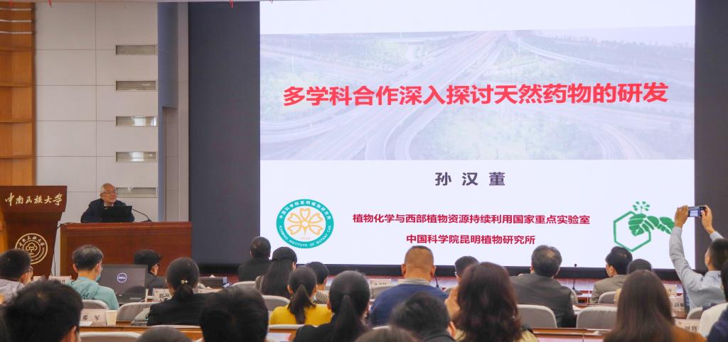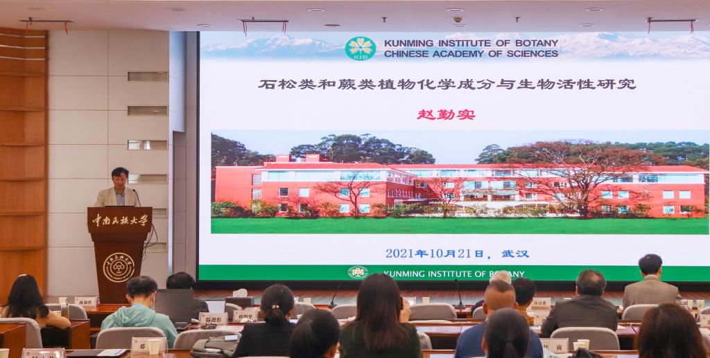 隨后,12名專家學者圍繞“天然產物化學與藥物化學”的主題進行交流,報告了近幾年的學術貢獻和重要創新成果。孫漢董院士以《多學科合作深入探討天然藥物的研發》為題,報告了對天然藥物研發的思考,認為天然產物藥物研發必須融合藥物化學、藥理學等多學科知識,才能取得重大成果。中國科學院昆明植物研究所研究員趙勤實結合實驗結果,介紹了石松類、蕨類植物的化學成分與生物活性情況,報告了課題組近年來的相關研究進展。我校藥學院馮濤教授報告了“真菌特有天然產物研究”情況,列舉了課題組近年來在真菌特有的倍半萜、二萜和三萜方面研究取得的系列成果,包括新類型化合物的發現以及藥理活性方面的進展。參會專家學者就面臨的學術難點、發展瓶頸進行了深入的現場交流,共同呈現了一場精彩的學術盛宴。