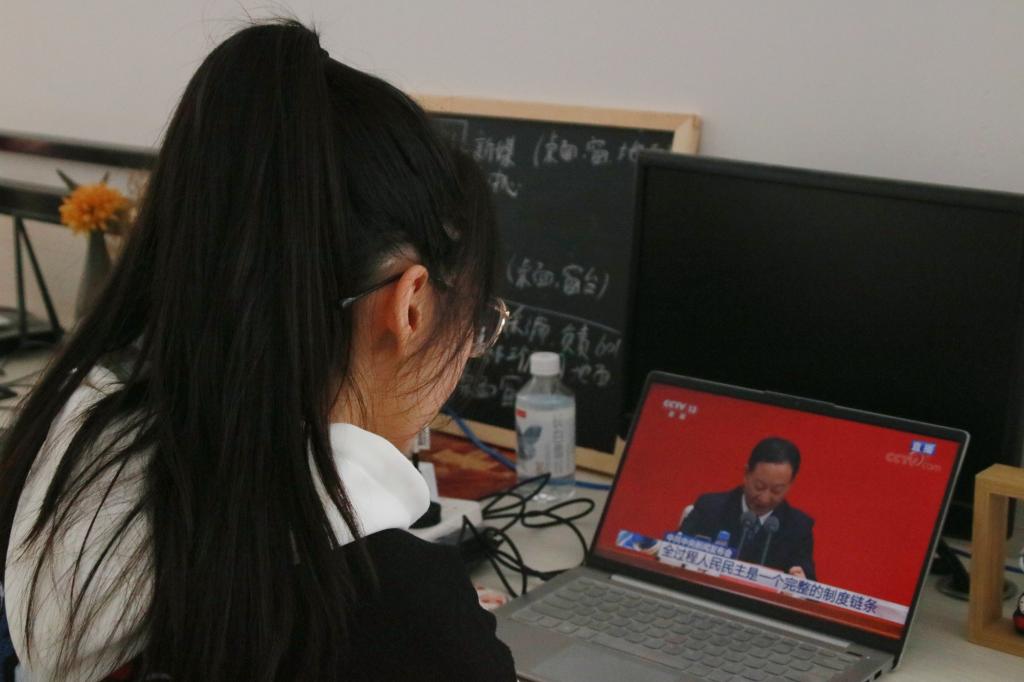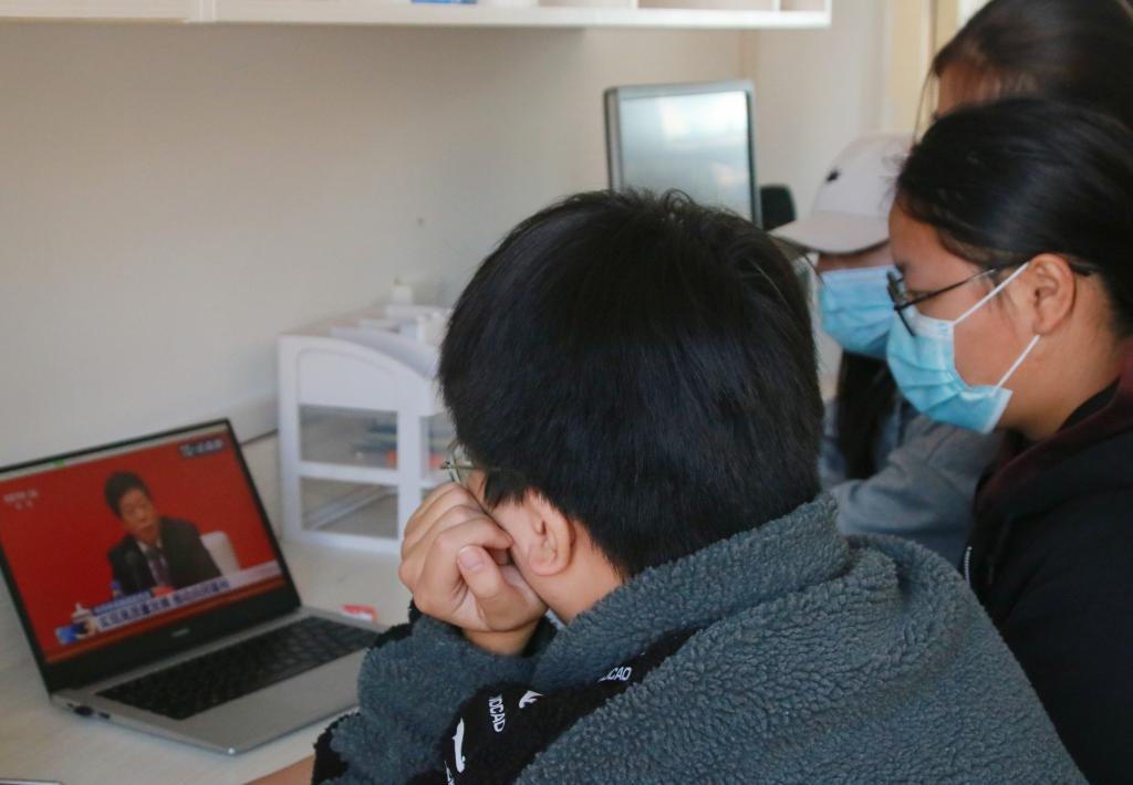 學生收聽收看黨的十九屆六中全會精神新聞發布會直播。王琦 攝
