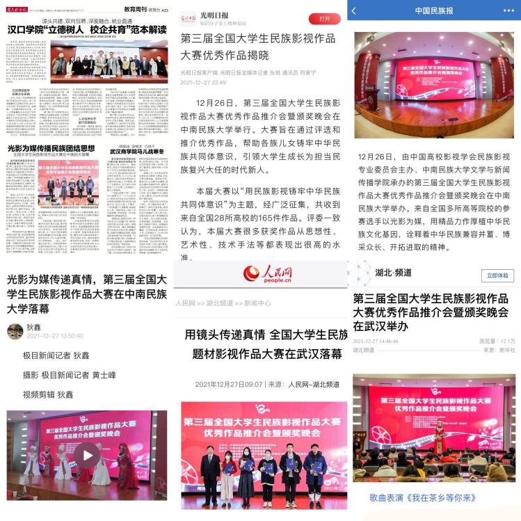 12月26日晚,由中國高校影視學(xué)會民族影視專業(yè)委員會、中國少數(shù)民族文化藝術(shù)促進會影視委員會主辦,我校文傳學(xué)院和“萬里茶道”聯(lián)合申報世界文化遺產(chǎn)辦公室承辦,國家文物局“互聯(lián)網(wǎng)+中華文明“示范基地協(xié)辦的第三屆全國大學(xué)生民族影視作品大賽在學(xué)術(shù)交流中心落下帷幕。我校副校長杜冬云、部分高校領(lǐng)導(dǎo)、獲獎師生代表以線上線下相結(jié)合的方式,共同參與了當晚舉行的大賽優(yōu)秀作品推介會暨頒獎晚會。