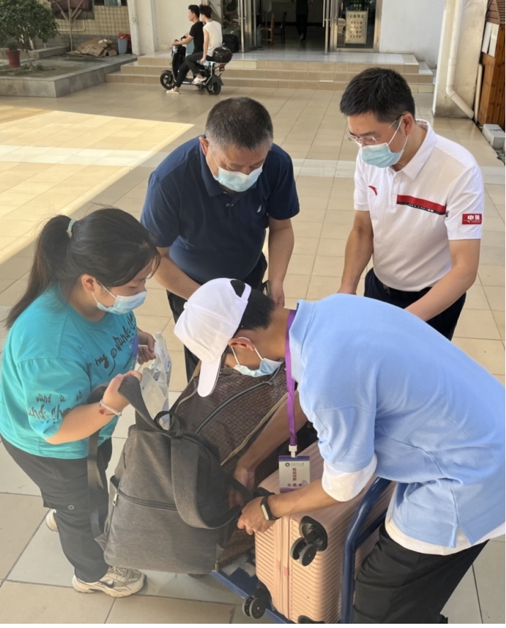 聞亮、楊春勇與志愿者一同為張園園搬行李。 電信學院供圖