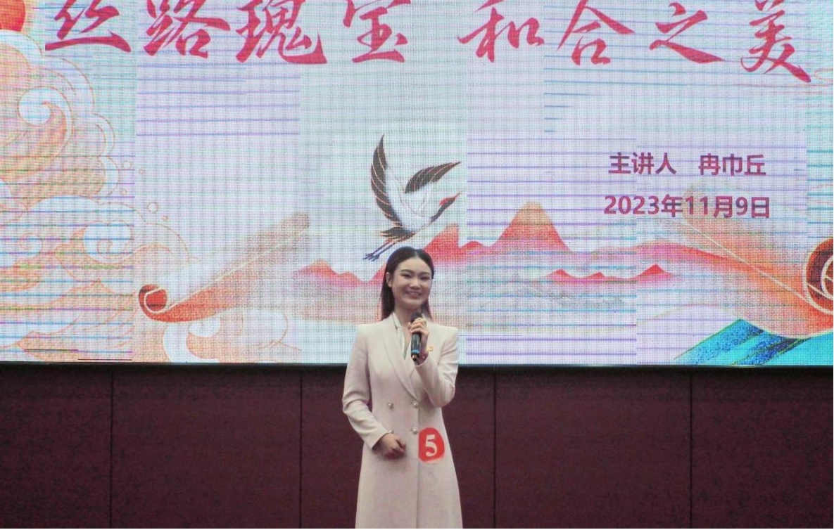 冉巾丘以《絲路瑰寶,和合之美》為題,選取國家民委“道中華”公眾號文章《一錦千年:“五星出東方利中國”里的民族交融史》作為宣講素材,圍繞新疆尼雅遺址出土的蜀錦護臂和其上的篆文“五星出東方利中國”,講述中原地區(qū)與邊疆地區(qū)文化交流的故事,再現(xiàn)中國大地上民族交流融合的歷史,以小見大生動地面向全省青年講述中華民族共同體故事,帶領(lǐng)在場觀眾領(lǐng)略中華文明多元一體的魅力。