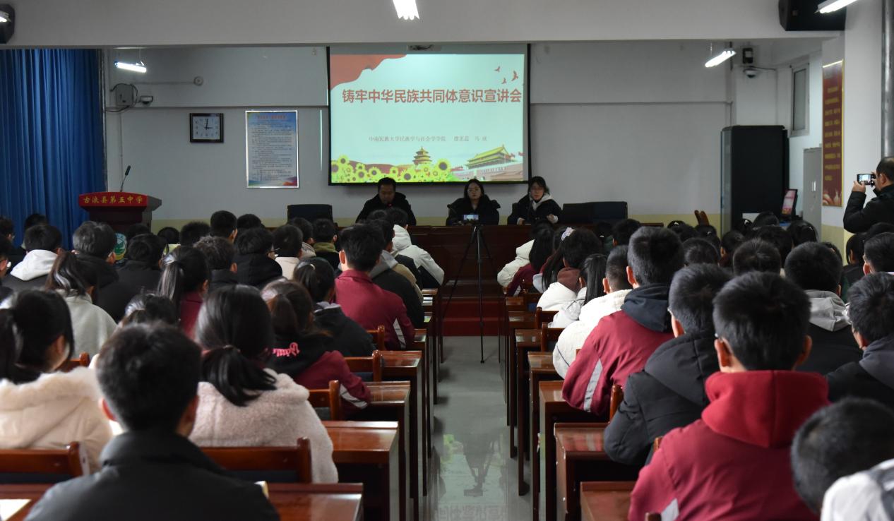 一路講,講青年使命,宣講故事深入淺出。23日下午,宣講團成員馬欣、擺思蕊在古浪縣第五中學作題為《新征程上鑄牢中華民族共同體意識的青年行動與思考》的主題理論宣講。宣講中,團隊成員從青年視角出發,闡釋鑄牢中華民族共同體意識的深刻內涵,分析如何實現各民族更好地交往交流交融。他們用“小故事”講“大道理”,同時介紹了鑄牢中華民族共同體意識的民大實踐、民大經驗,將深刻的理論內涵融入一個個鮮活的故事案例中,并輔以相關視頻,以“青”言“青”語在學生心中播撒鑄牢中華民族共同體意識的“金種子”,獲得在場師生的一致好評。