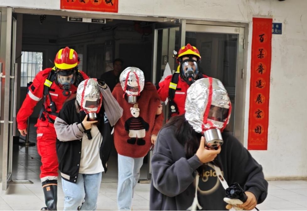 “現在我們收到消息,有兩名學生被困火場,我們的義務消防隊隊員立刻穿戴氧氣瓶和防煙面罩,準備進場救人。”在疏散演習中,只見3A學生公寓濃煙滾滾,消防員駕駛著消防車從遠處駛來,迅速穿戴消防裝備沖入火場,成功營救出被困人員及“傷員”。疏散演習環(huán)節(jié)通過使用煙霧彈、拉響警報、消防車進場出水、醫(yī)護人員搶救“傷員”等方式模擬真實火災場景,引起師生陣陣驚呼,現場氛圍濃厚。參與活動的師生反應迅速,嚴格按照應急逃生路線有序疏散,用衣服等物品捂住口鼻,低姿、快速穿越煙霧區(qū),順利到達安全區(qū)域。疏散演練后,保衛(wèi)部人員就撥打消防應急電話、應急處置流程、消防經典案例等方面為師生講解了相關消防安全知識。