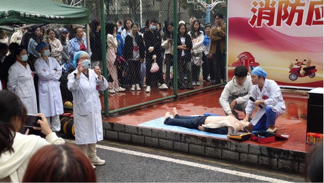 “1001、1002、1003——患者意識喪失,現在時間是下午兩點半,幫忙呼叫120”,醫(yī)護人員在現場對模擬“傷員”的人偶模型進行緊急心肺復蘇搶救的同時,面向師生詳細講解了心肺復蘇要領和自動體外除顫器(AED)的使用方法。現場大量師生參與學習并積極互動。