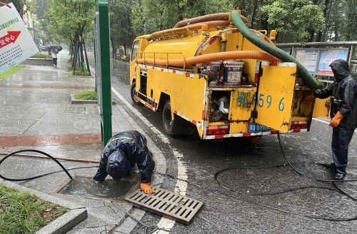 水電中心組織員工在校內巡查、疏通各雨水井,確保雨水順利入南湖。