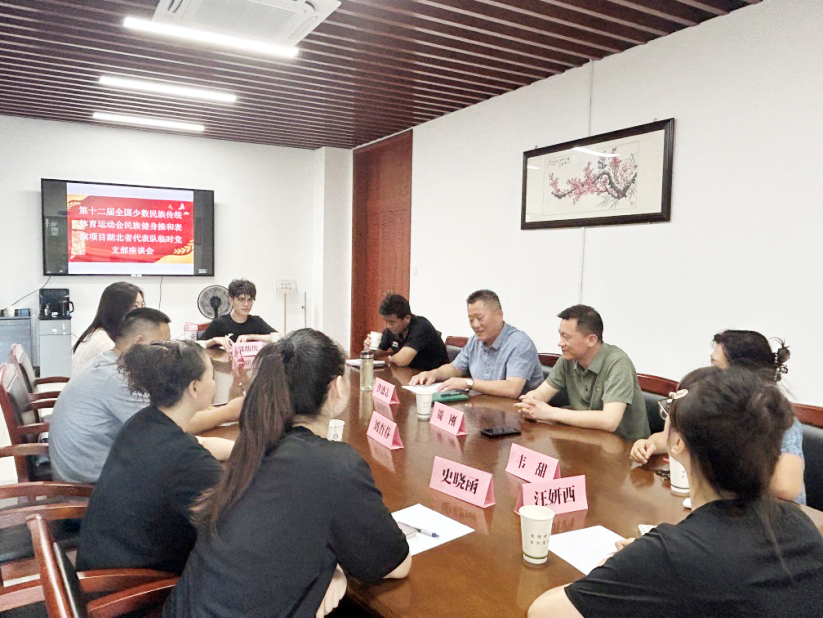 洪盛志首先宣讀了《關(guān)于成立第十二屆全國(guó)少數(shù)民族傳統(tǒng)體育運(yùn)動(dòng)會(huì)民族健身操和表演項(xiàng)目湖北省代表隊(duì)臨時(shí)黨支部的決定》,明確了臨時(shí)黨支部和黨小組的組織架構(gòu)和職責(zé)。隨后,周剛強(qiáng)調(diào)了成立臨時(shí)黨支部的背景和重要意義。他希望臨時(shí)黨支部充分發(fā)揮功能型黨支部作用,在整個(gè)暑期訓(xùn)練中,通過(guò)黨員、發(fā)展對(duì)象、入黨積極分子密切聯(lián)系群眾,以鑄牢中華民族共同體意識(shí)為主線,把全體參訓(xùn)學(xué)生像石榴籽一樣團(tuán)結(jié)起來(lái),刻苦訓(xùn)練,爭(zhēng)創(chuàng)佳績(jī)。