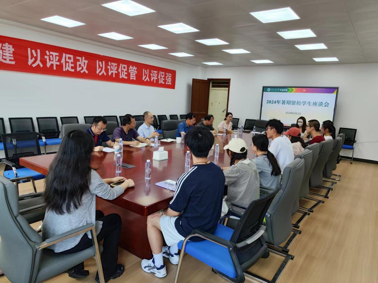 座談會上,學生代表暢所欲言,介紹了學習、實習、生活等方面的基本情況,并針對遇到的生活問題與學習困惑進行了充分交流。學院領導分別表達了對留校學生的誠摯關懷,同時對同學們暑假留校堅持學習和實習實踐給予了鼓勵和肯定,并根據教學經驗和自身經歷,就學習過程中的目標選擇、學習方法、備考進度和心理調適等進行有效引導,答疑解惑。同時,提醒同學們嚴格遵守學校假期管理規定,嚴格請銷假流程,杜絕晚歸,提升安全防范意識。