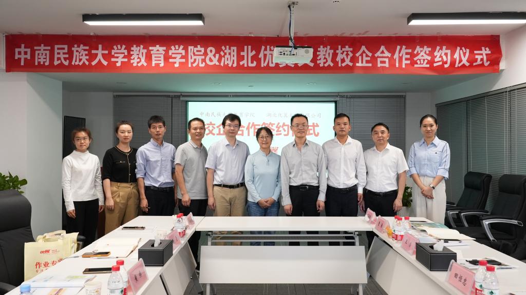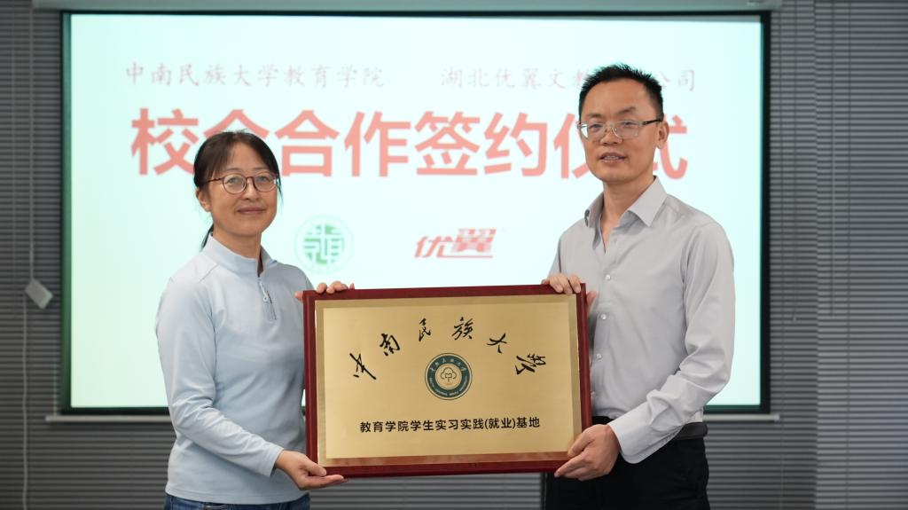 雙方代表簽訂了校企人才合作協議書。林晉向湖北優翼文教有限公司授教育學院學生實習實踐(就業)基地牌。
