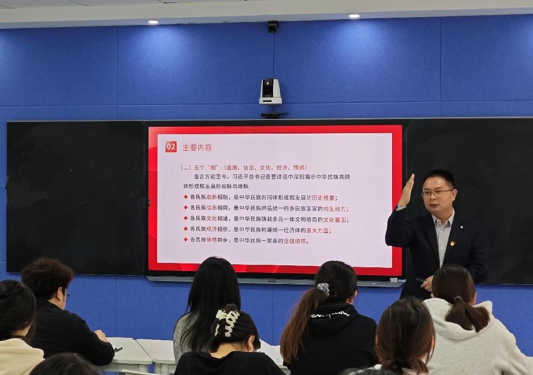 賀展從“兩個大局”的高度和“兩個結合”的深度來引導大家深刻理解鑄牢中華民族共同體意識是習近平總書記作出的重大原創(chuàng)性論斷,是馬克思主義民族理論中國化時代化的最新成果。他通過對比歷屆全國民族團結進步表彰大會盛況,來介紹學校中華民族共同體學院(研究院)被中共中央、國務院授予“全國民族團結進步模范集體”榮譽稱號的含金量。這不僅是榮譽,也代表著黨和國家沉甸甸的信任與責任。他還分享了在表彰大會中的見聞與感想,讓同學們深刻領會了習近平總書記在全國民族團結進步表彰大會上發(fā)表重要講話中蘊含的深刻道理。