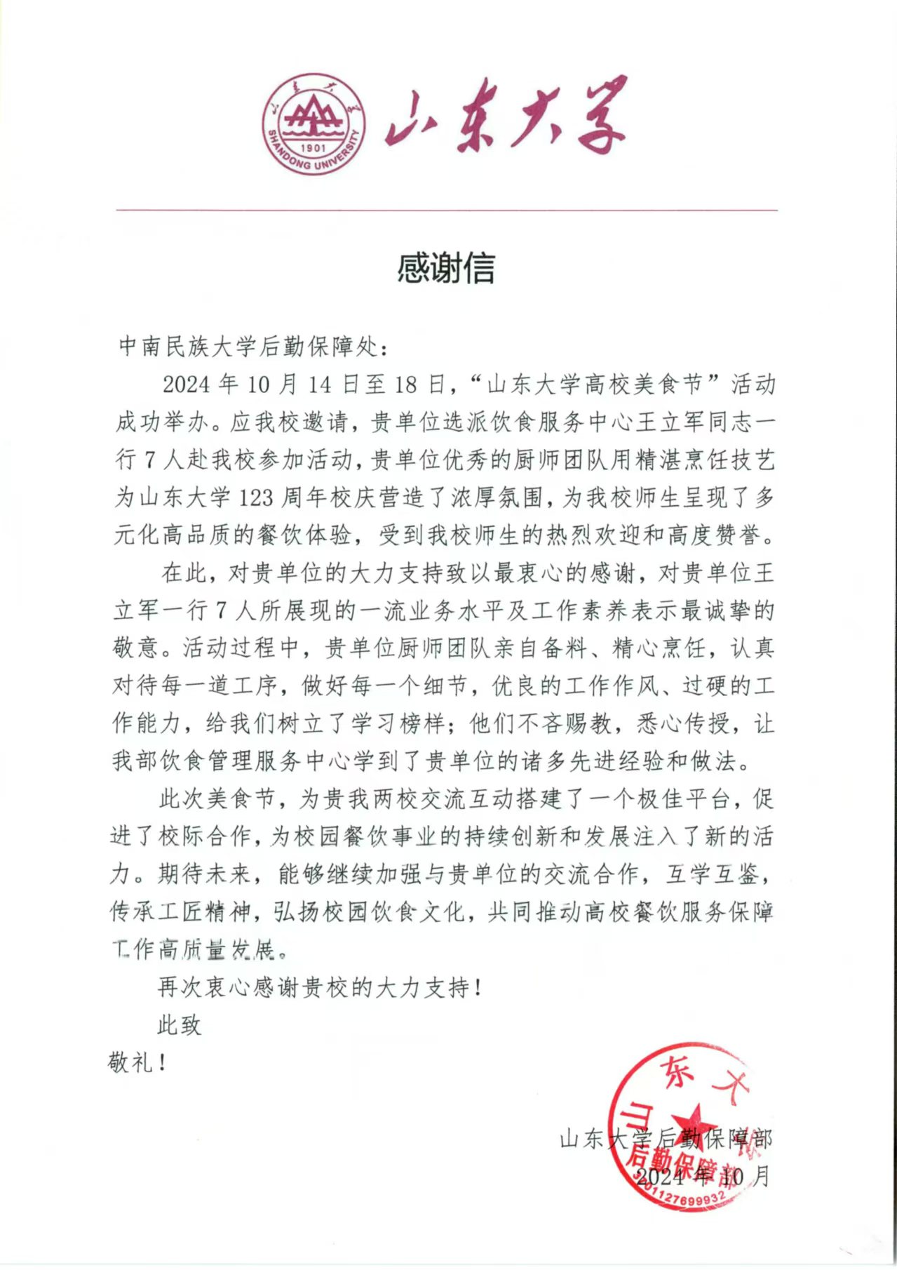 10月29日,山東大學后勤保障部致信我校后勤保障處,感謝我校廚師團隊用精湛的烹飪技藝為山東大學123周年校慶營造了濃厚氛圍,為廣大師生呈現了多元化、高品質的餐飲體驗。