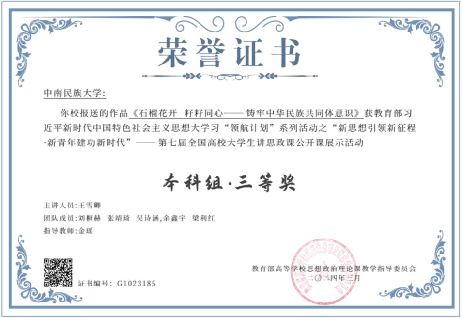 3月18日,由教育部高校思想政治理論課教學指導委員會主辦、南開大學馬克思主義學院承辦的第七屆全國高校大學生講思政課公開課展示活動評選結果揭曉,我校報送的課程作品《石榴花開 籽籽同心——鑄牢中華民族共同體意識》榮獲全國高校本科組三等獎。