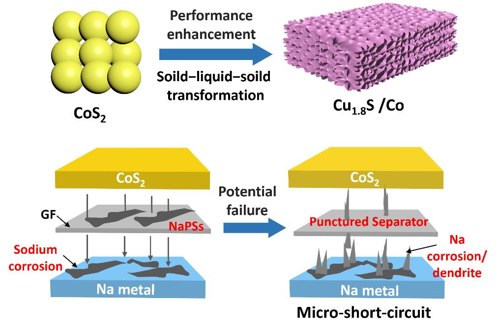 CoS2儲鈉性能增強、電池失效機制示意圖。 化材學院供圖
