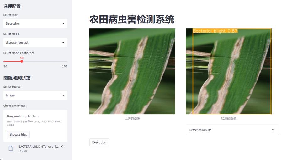 楊楊同學的論文題為An Improved YOLOv8-Based Rice Pest and Disease Detection。他的研究工作關注現階段的基于深度學習的方法對農作物病蟲害檢測存在檢測精度低、速度慢、部署困難且漏檢率高的問題,提出了一種改進的病蟲害檢測模型 YOLOv8-HSFPN。圖1為該模型在水稻病蟲害上的識別結果;圖2為基于該模型設計并開發的基于Web端的農田病蟲害檢測系統,方便相關人員通過網絡便捷、實時進行農田病蟲害識別和監測。