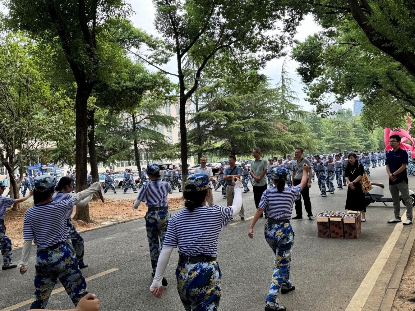 休整階段,教官整隊后,同學們秩序井然地接過學院領導遞來的飲料。每一份飲品都承載著學院對同學們的深切關懷與殷殷期望,展現了學院對軍訓育人工作的高度重視。
