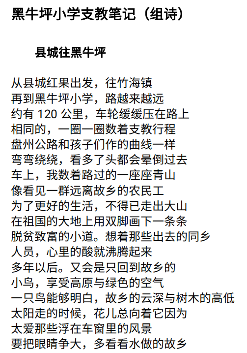 鎴戦櫌2018綰ф湰縐戠敓鏇句竾鍚屽鐨勭粍璇椼婇粦鐗涘潽灝忓鏀暀絎旇銆嬭崳鑾峰垱浣滅被浣滃搧涓絳夊銆傘婇粦鐗涘潽灝忓鏀暀絎旇銆嬶紙緇勮瘲錛夎褰曚簡鏇句竾鍚屽2020騫寸柅鎯呮湡闂達紝鍦ㄥ涔¤吹宸炵渷鐩樺窞甯傜殑涓涓亸榪滀埂鏉戝皬瀛?0澶╂敮鏁欑敓媧葷殑鎵瑙併佹墍闂匯佹墍鎰燂紝琛ㄨ揪浜嗕粬瀵瑰涔″拰瀛︾敓鐨勭儹鐖變箣璇楓?/p>