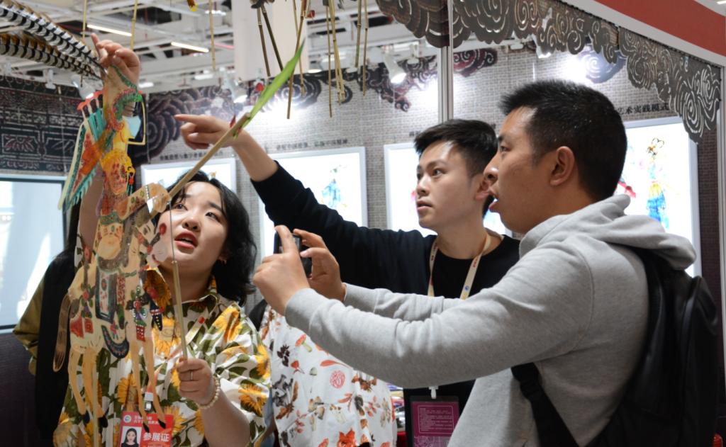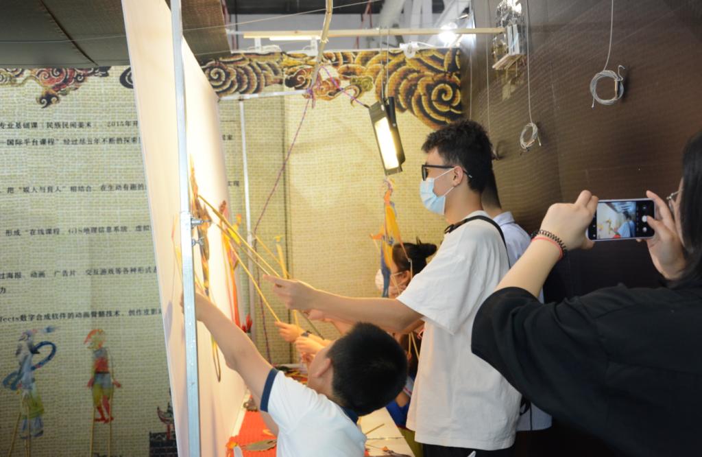 展演中,我校師生展示了工作坊創(chuàng)作的皮影劇——《哪吒傳奇》。不時有觀眾來到工作坊操作臺前就坐,在剪影、上色、綴結(jié)等環(huán)節(jié)中體驗皮影創(chuàng)作的過程。還有觀眾通過電腦體驗工作坊開發(fā)的虛擬仿真實驗環(huán)節(jié),對皮影雕刻和操縱表演進行模擬操作。工作坊指導(dǎo)教師潘俊、王海濤全程進行現(xiàn)場指導(dǎo),學(xué)生成員董天方、陳羽佳、王力笠、方俊婕、肖琴、李會玲、朱靜怡、張瀚分兩批先后赴成都參加展演。活動中,潘俊老師、董天方同學(xué)先后接受了媒體采訪。