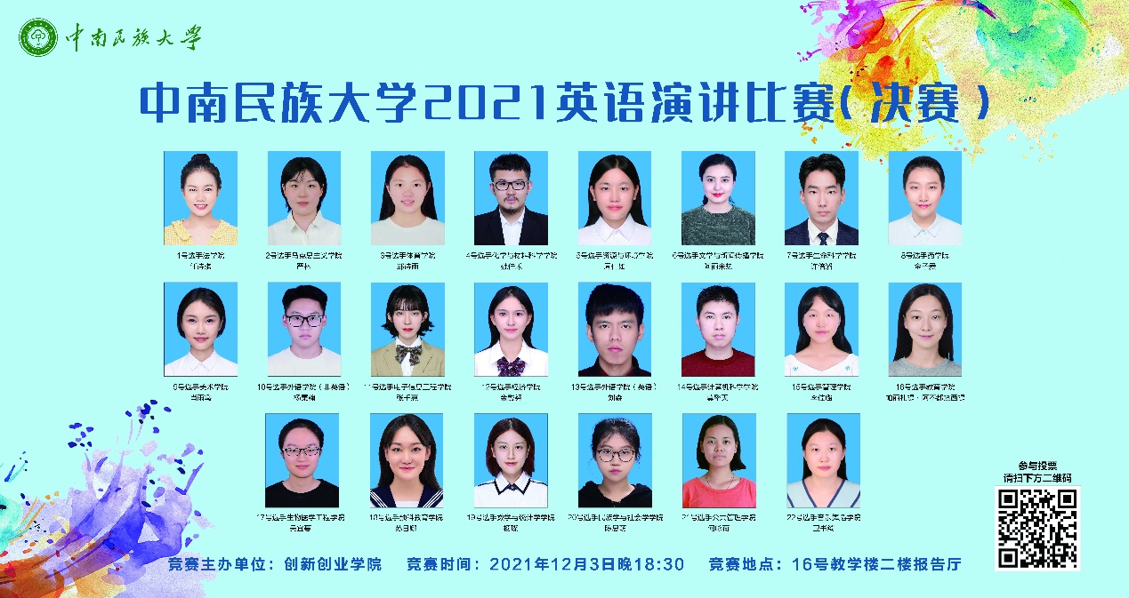 本次賽事共設一等獎2名,二等獎4名,三等獎7名,優秀獎若干名;同時設最佳語音獎和最具人氣獎各1名。經過激烈角逐,外語學院劉淼、化材學院魏佳禾獲得一等獎;外語學院楊秉翰、生科學院許倍滔、教育學院帕麗扎提、文傳學院阿麗米熱獲得二等獎;美術學院肖雨鑫、經濟學院金戴努、馬克思學院嚴林、計科學院莫擎天、音舞學院衛書綺、管理學院李佳璐、藥學院金子愛獲得三等獎;電信學院張千惠等9名同學獲得優秀獎。化材學院魏佳禾獲得最佳語音獎、法學院任詩琪獲得最具人氣獎。
