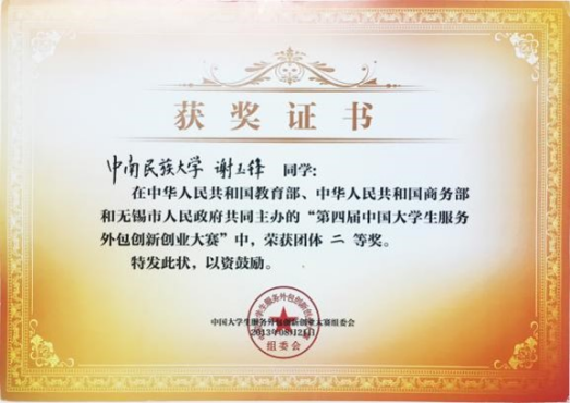 謝玉鋒團隊獲得第四屆中國大學生服務外包創新創業大賽團體二等獎。 本人供圖