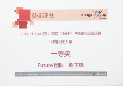 謝玉鋒團隊獲得2013微軟“創新杯”中國區選拔賽中南民族大學一等獎。 本人供圖