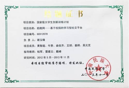 謝玉鋒團隊國家級大學生創新訓練計劃結題證書。 本人供圖