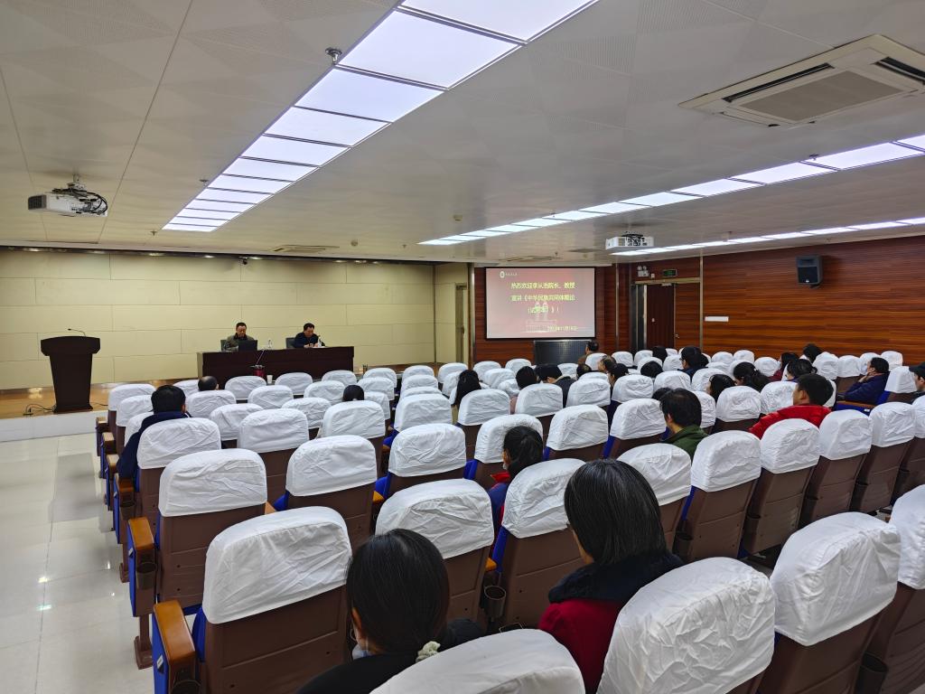 為落實國家民委有關工作部署,著力打造高校鑄牢中華民族共同體意識教育特色思政課程,11月16日下午,我校中華民族共同體學院(研究院)院長李從浩教授應邀在16號教學樓217報告廳宣講《中華民族共同體概論(試用本)》。宣講活動由實驗教學與工程訓練中心、創新創業學院黨總支書記鐘利主持,單位全體教職工參加。