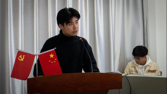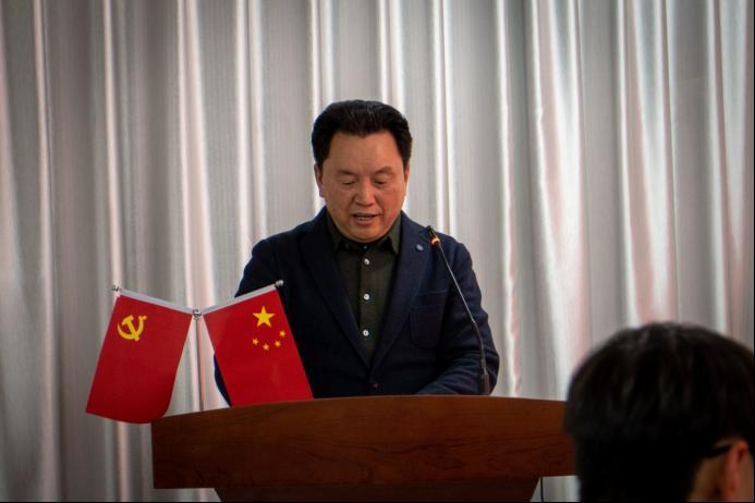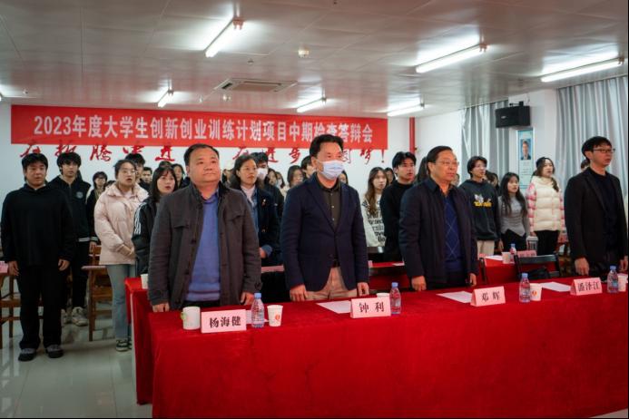 全體起立,奏唱國歌,創服活動管理辦公室供圖 活動伊始,創新創業學院黨總支書記鐘利為本次活動致辭,鼓勵在場社團負責人不負使命,做好本職工作,將學生社團建設好。