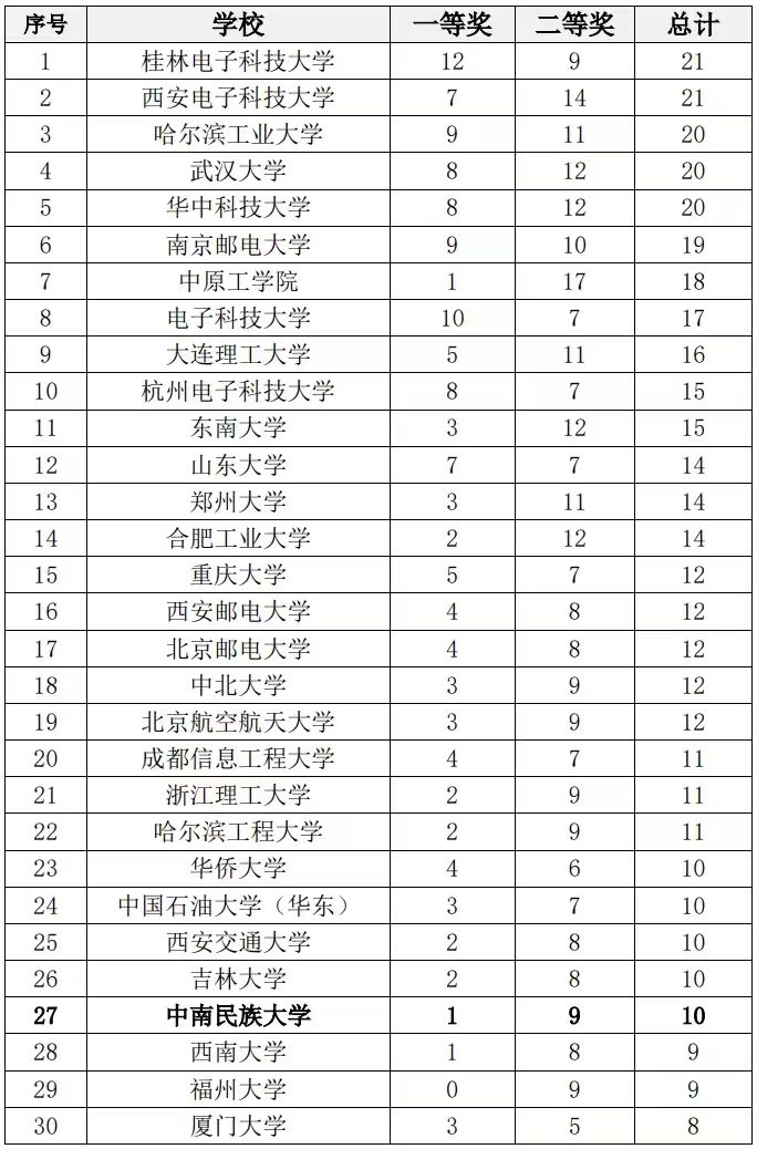 今年我校電賽成績再創新高,獲得全國一等獎1項,全國二等獎9項。排名全國第27名,比2023年第29名進步2名,在雙一流、電子類高校扎堆的名單中中南民族大學格外耀眼!