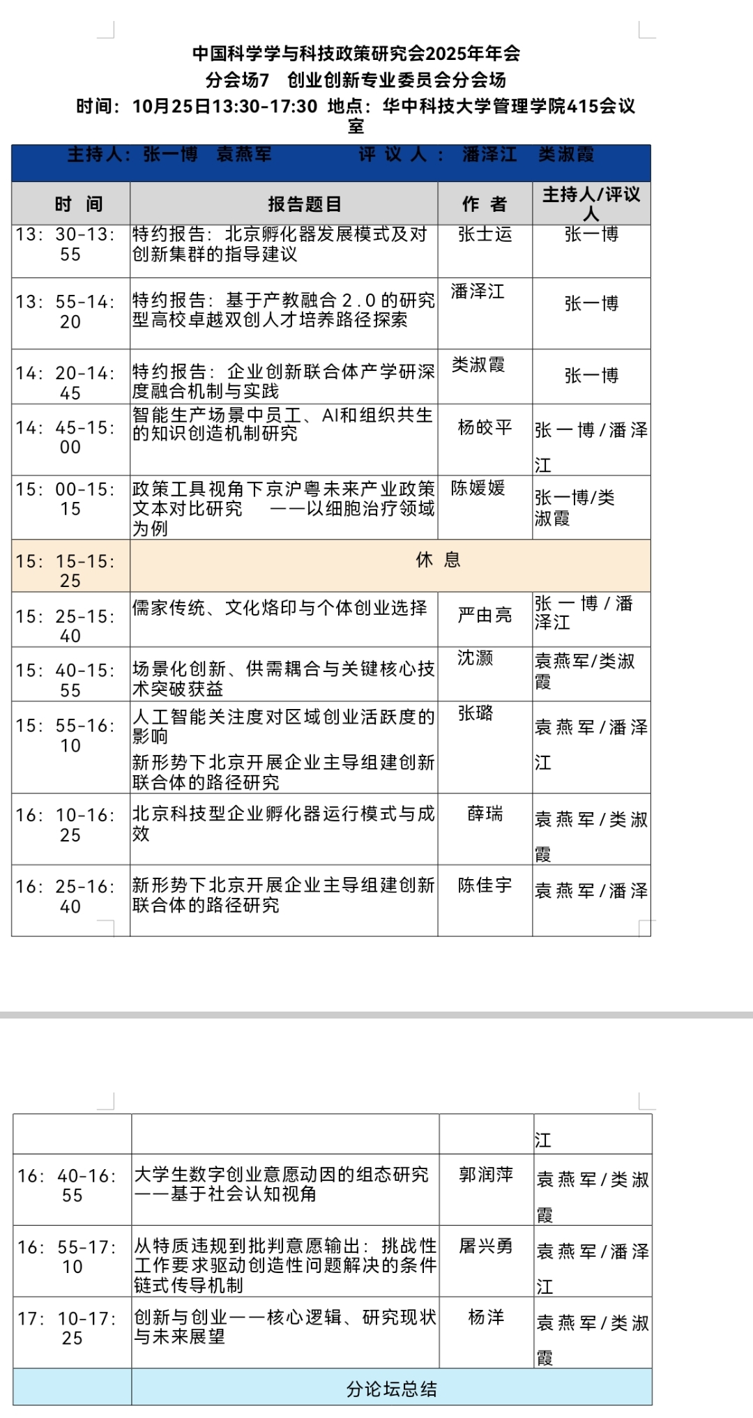2025年10月24-26日,備受矚目的第二十一屆中國科技政策與管理學術年會在華中科技大學隆重舉行。本次會議匯聚了國內外該領域的頂尖學者與科研新銳,共同最新研究進展與發展趨勢。我院潘澤江教授和研究生王林順、完世琪應邀出席本次學術盛會,潘澤江教授作為特邀嘉賓做大會報告,同時擔任分會場評議人,展現了我校在該領域的學術影響力與活力。