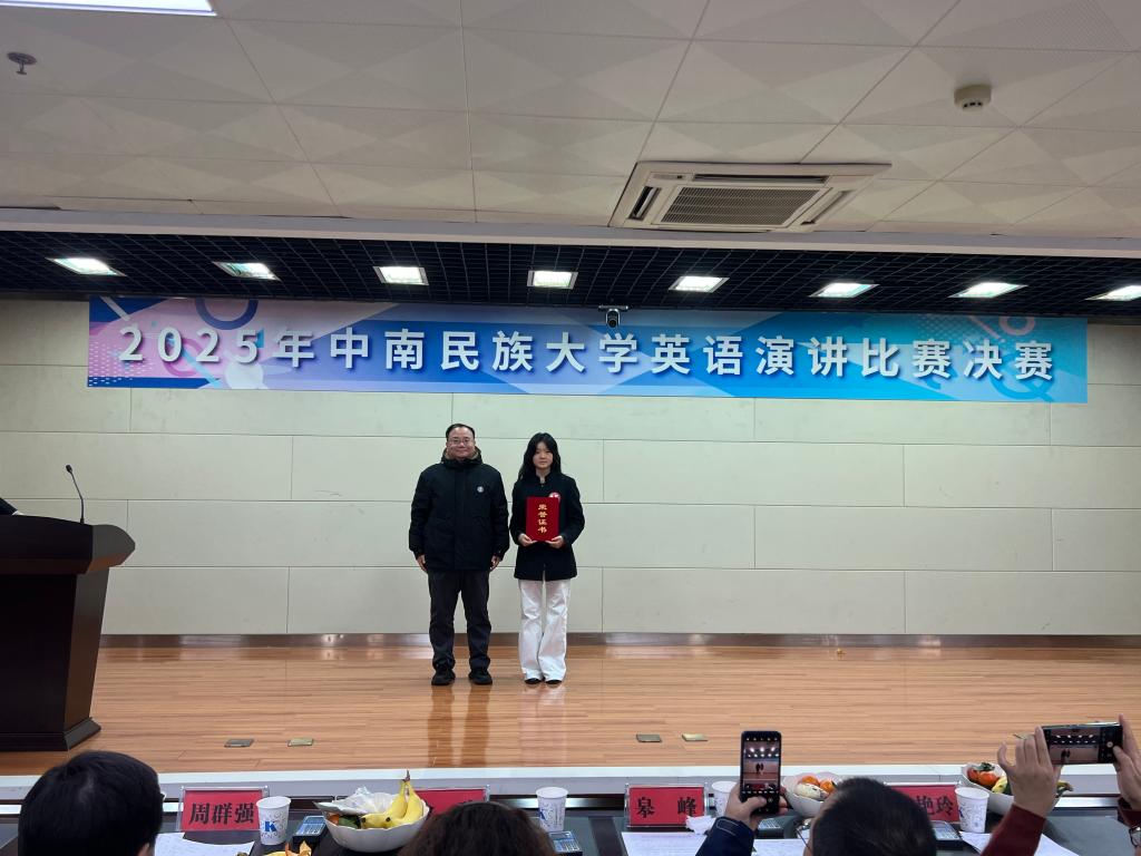 本次決賽共設一等獎1名,二等獎3名,三等獎5名,優秀獎11名,同時設最佳語音獎和最具人氣獎各1名。經過激烈角逐,15號選手外語學院馮詩圓獲得一等獎;9號選手民族學與社會學學院李青蔻、18號選手化學與材料科學學院王奕婷、17號選手計算機學院曹樂獲得二等獎;20號選手生物醫學工程學院黃丹藝、2號選手預科教育學院楊雨牧、16號選手資源與環境學院柴雨萌、12號選手國家安全學院周涵銳、10號選手生命科學學院楊琰獲得三等獎;法學院張淳善等11名同學獲得優秀獎。2號選手預科教育學院楊雨牧獲得最佳語音獎、3號選手文學與新聞傳播學院包語恬獲得最具人氣獎。