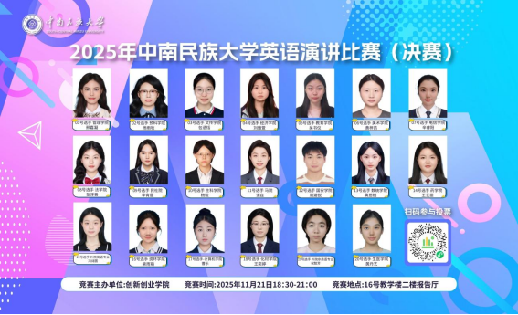 11月21日晚,我校2025年英語演講比賽決賽在16號教學樓二樓報告廳成功舉辦。此次賽事由創新創業學院主辦、各學院協辦,來自19個學院的20名選手參加了本次決賽。大賽評委由外語學院皋峰、馮艷玲、胡江波、金玲、周群強等5位老師擔任,創新創業學院院長潘澤江、副院長楊海健出席了大賽并頒獎。