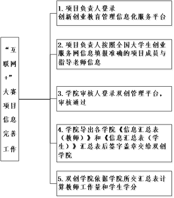 全校共2051個參賽項目開展信息完善工作(各學院參賽項目詳情見附件3),請務必確保每個項目的負責人登錄系統完善信息。信息完善流程詳見下圖,具體網上操作詳見附件1-2。
