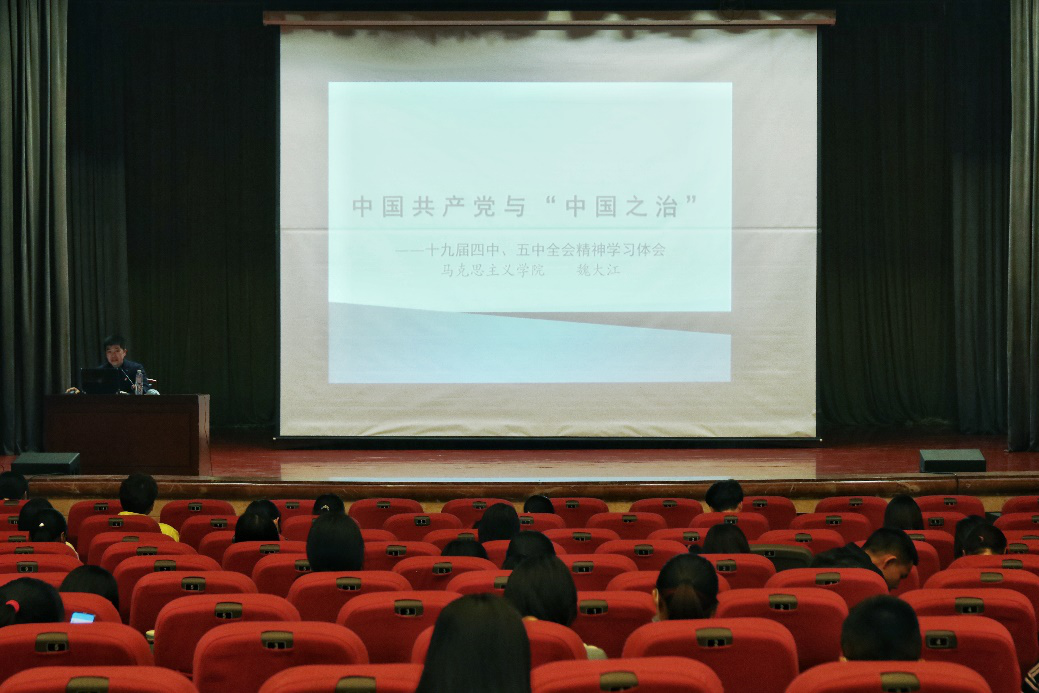馬克思主義學院黨委書記魏大江開展以《中國共產(chǎn)黨與“中國之治”》為題的專題培訓。他指出十九屆四中、五中全會在政治、戰(zhàn)略、歷史三個方面的重大意義,從時間背景、地位意義、內(nèi)容解讀和中國之治四個方面分享對十九屆四中、五中全會精神的學習體會。