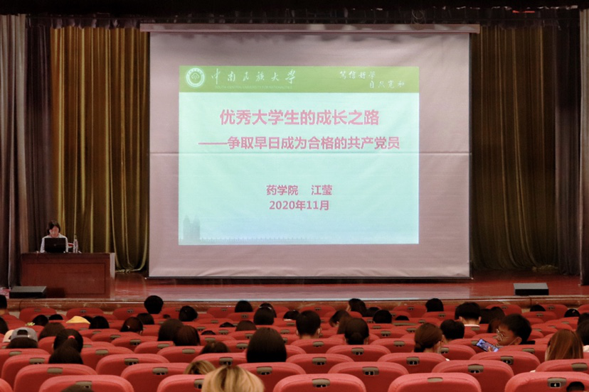 藥學院黨委書記江瑩以《優(yōu)秀大學生的成長之路——爭取早日成為合格的共產(chǎn)黨員》為主題,結(jié)合歷史條件、理論依據(jù)和發(fā)展沿革深入解讀黨員發(fā)展方針的重大調(diào)整,指出新方針領導下黨員發(fā)展工作的方向和要求。她建議同學們學習優(yōu)秀黨員榜樣,明確自身發(fā)展方向,提高科學文化修養(yǎng),成為一名不負青春、不負時代、不負國家的優(yōu)秀黨員。