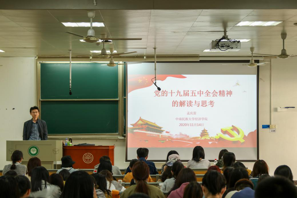 隨后經濟學院副院長孟慶雷對黨的第十九屆五中全會做出深入解讀。他認為在我國即將實現第一個百年奮斗目標,開啟全面建設社會主義現代化國家新征程的當下,五中全會的召開是一次具有全局性、歷史性意義的重大事件。他要求全體學員必須堅持黨的全面領導,緊密團結在以習近平同志為核心的黨中央周圍,同心同德,頑強奮斗,奪取全面建設社會主義現代化國家新勝利。