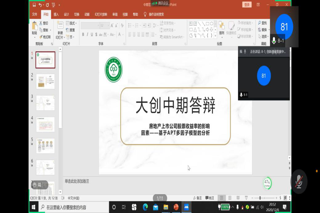本站訊(記者:滕柳彤)為強化學生創新創業能力,檢驗各團隊項目進展,12月6日晚,經濟學院于線上舉行2020年大學生創新創業訓練計劃中期檢查答辯。共10支隊伍參與本次線上答辯。學院副院長熊芳、教師陳全功、王小君、甘天琦、學院團委書記高無盡等擔任評委。