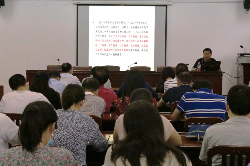 閻占定以《學(xué)習(xí)黨史 銘記黨的百年光輝歷程》為主題,圍繞黨史學(xué)習(xí)的背景、意義、基本要求、目的和黨史發(fā)展主流本質(zhì)展開講解。他表示,開展黨史學(xué)習(xí)教育是鞏固和深化“不忘初心 牢記使命”主題教育成果的重要舉措,是進(jìn)入中華民族偉大復(fù)興歷史偉業(yè)的必然要求。各教職工應(yīng)積極接受黨史學(xué)習(xí)教育,提高自身政治思想覺悟;在黨史學(xué)習(xí)過程中不斷加強(qiáng)自身黨性鍛煉,堅(jiān)定馬克思主義信仰,踐行社會(huì)主義核心價(jià)值觀,實(shí)現(xiàn)學(xué)史明理、學(xué)史增信、學(xué)史崇德、學(xué)史力行;要明確黨史的思想內(nèi)涵,理解馬克思主義,牢記黨的初心和使命,真正做到知史愛黨、知史愛國(guó)。他強(qiáng)調(diào),百年黨史是黨的不懈奮斗史、理論創(chuàng)新創(chuàng)造史、精神譜系鑄就史和自身建設(shè)史。大家要自覺汲取信念堅(jiān)定、不怕犧牲、樂觀無(wú)畏、拼搏奮斗的革命精神力量,為實(shí)現(xiàn)中華民族偉大復(fù)興的中國(guó)夢(mèng)不斷奮斗。