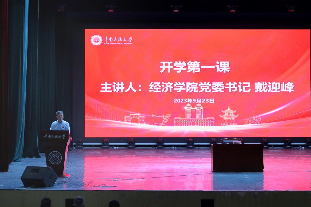 在廣大新生開啟新的大學生活之際,戴迎峰以《爭做新時代中國特色社會主義的紅色“經濟人”》為題,給同學們講授開學第一課。他首先和大家一起溫習了校黨委書記邊境同志和校長李金林同志在軍訓結束以及開學典禮上的講話精神,要求同學們認真完成校長在會上布置的兩項任務。