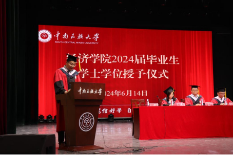 6月14日下午,經濟學院2024屆本科畢業生畢業典禮暨學士學位授予儀式在大禮堂舉行。中南民族大學黨委常委、副校長方德斌、經濟學院領導、專業教研室負責人、各年級輔導員、班導師、部分教師代表、學生家長蒞臨現場,經濟學院2024屆畢業生到場參加。典禮和儀式由經濟學院副院長馬楠主持。