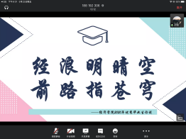 本站訊(記者:王娜)經浪明晴空,前路指蒼穹。5月22日晚,經濟學院2020年優秀畢業生訪談在騰訊會議如期舉行。本次訪談會邀請到五位在就業、留學方面優秀的2016級畢業生進行了分享。學院黨委書記柯尊韜、副書記劉君強、2016級輔導員徐瑩、杜光耀、2019級輔導員高無盡、阿禾朱力及學院學生會主席團成員出席,學院300余學生線上參會。
