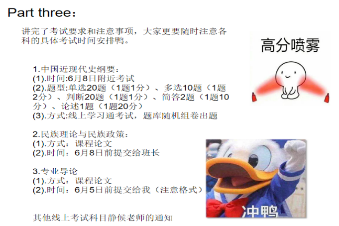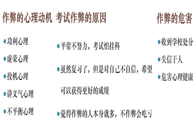 會前,各年級輔導員紛紛作了動員指導,要求各班學生高度重視,認真制作班會PPT,班委須組織本班學生完成誠信應考承諾書的電子簽名,宣讀《中南民族大學學生考試違規(guī)處理辦法》,明析考試違規(guī)行為的認定與處理,強調考試違規(guī)的后果,嚴肅考試紀律。各班級分別從考試時間安排、考試注意事項、復習備考建議等方面展開班內溝通交流,提出相關建議。金融1703班從作弊心理動機、作弊原因和作弊危害三個方面展開班會,并通過列舉有關誠信的名言警句呼吁同學誠信應考;金融1802班由班長帶領班級同學進行“堅持誠信考試”的宣誓,用響亮的聲音彰顯堅定誠信考試的決心;經(jīng)濟學類1908班分析線上考試的考試規(guī)則和考試要求,盤點網(wǎng)絡考試的注意事項,詳細總結近期線上考試科目的時間和題型,幫助同學們迅速進入考試狀態(tài)、有針對性地進行期末復習備考。