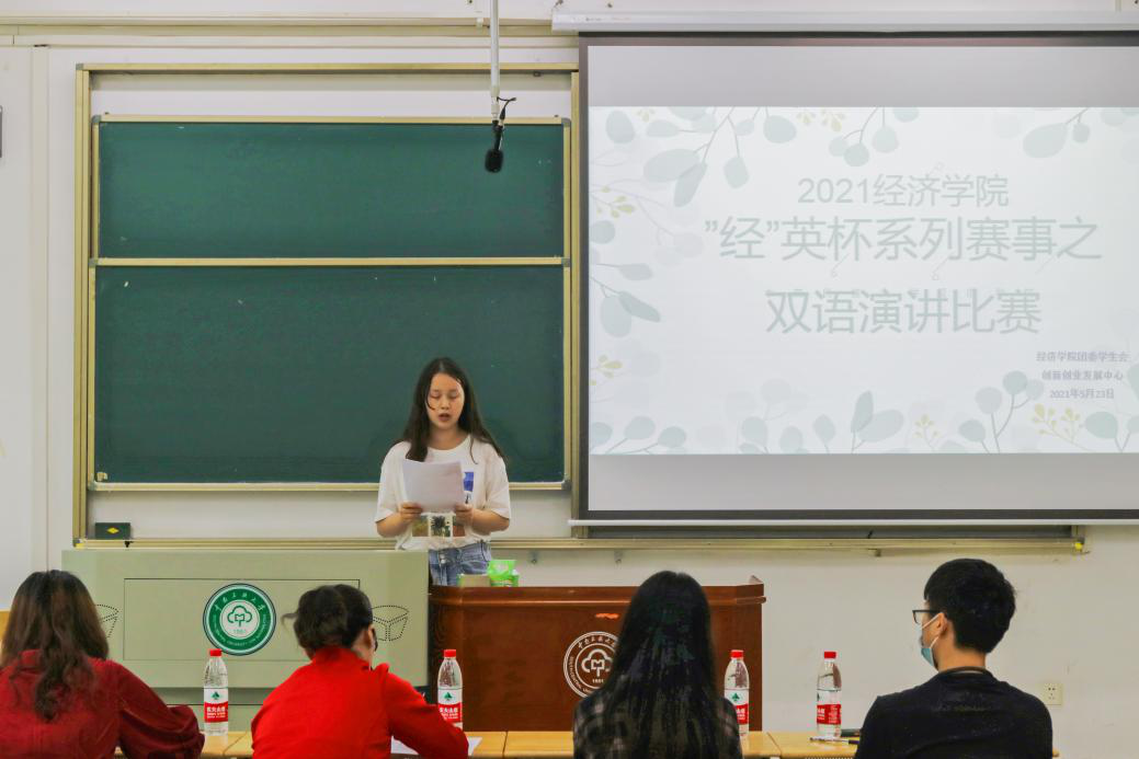 本站訊(記者:周贊)為展現青年大學生向上風貌,培養愛黨愛校、全面發展的青年人才,5月23日,經濟學院團委學生會創新創業發展中心在15號教學樓107教室舉辦了“經”英杯系列賽事之雙語演講比賽。比賽邀請外語學院教師馮艷玲、英語專業學生耿薇、翻譯專業學生黃宣渝、經濟學院金融專碩研究生王佳瑞擔當評委。