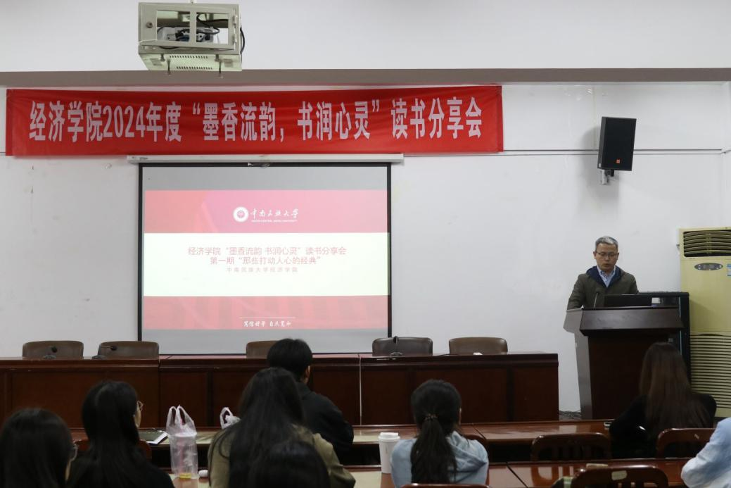 為了營(yíng)造濃厚的閱讀氛圍,進(jìn)一步建設(shè)書(shū)香校園,10月24日晚,經(jīng)濟(jì)學(xué)院于15號(hào)教學(xué)樓1006會(huì)議室舉辦了“墨香流韻 書(shū)潤(rùn)心靈”第一期“那些打動(dòng)人心的經(jīng)典”讀書(shū)分享會(huì)。經(jīng)濟(jì)學(xué)院團(tuán)委書(shū)記安樹(shù)庭、經(jīng)濟(jì)學(xué)院學(xué)習(xí)部全體成員參加分享會(huì)。會(huì)議由學(xué)習(xí)部干事阿倫主持。